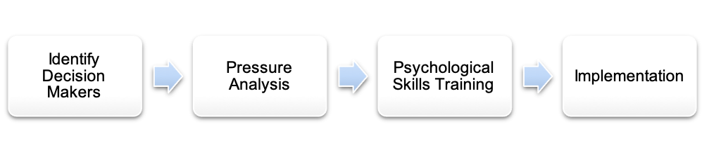 PT should begin with identifying decision makers, conducting a pressure analysis and training of athlete’s in psychological skills training;