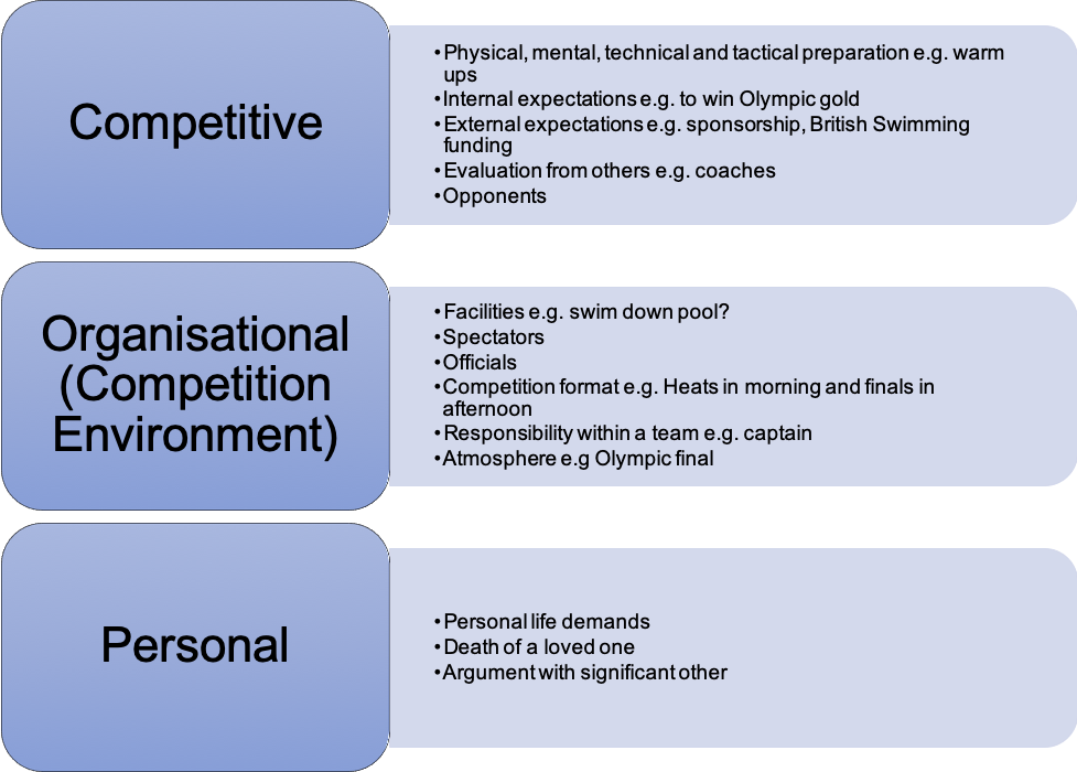 Elite swimming stressors are defined as any demand or combination of demands which “increases the importance of performing well on a particular occasion”[4] (p.610) and can be split into three types [3,5]: